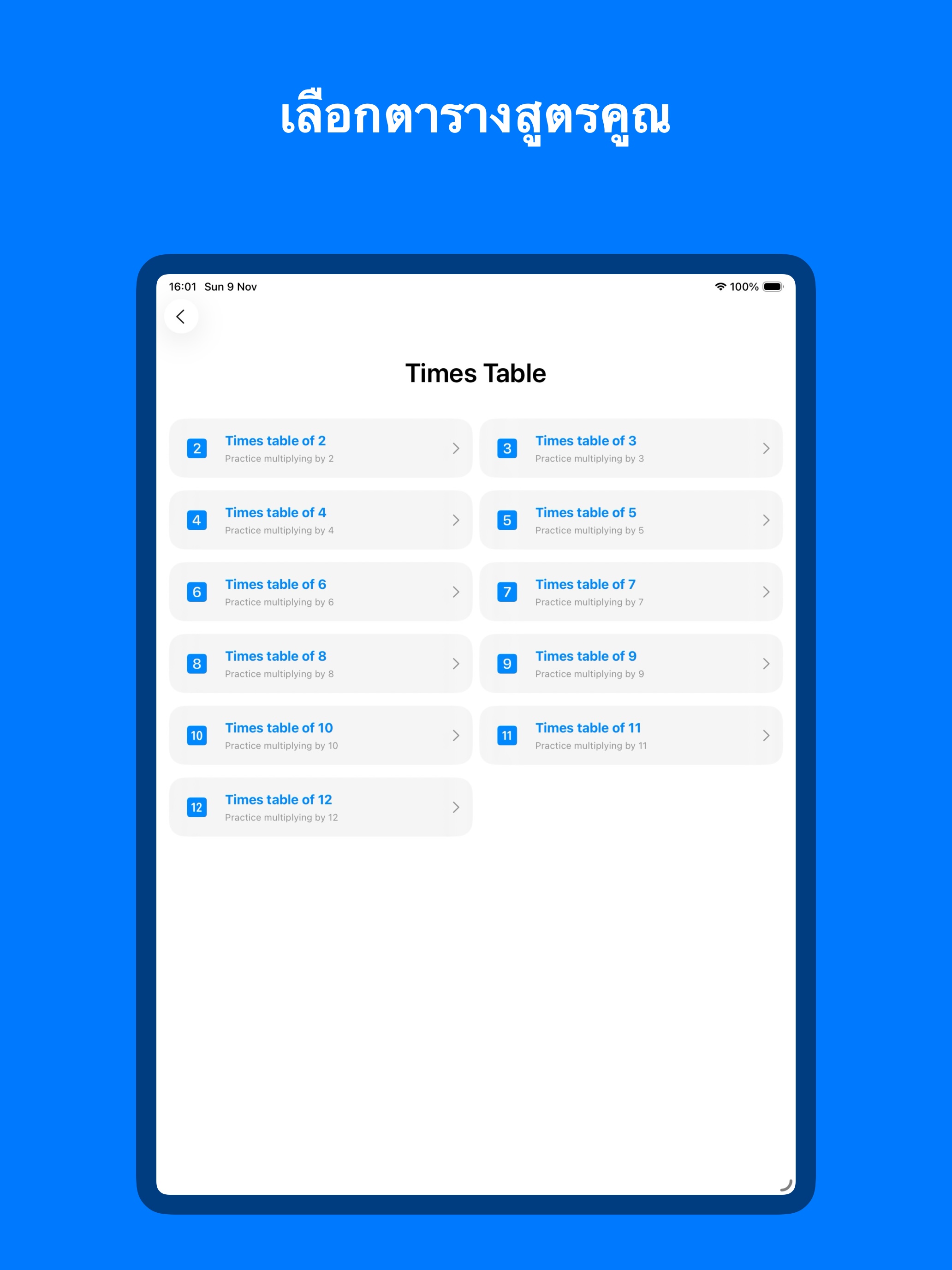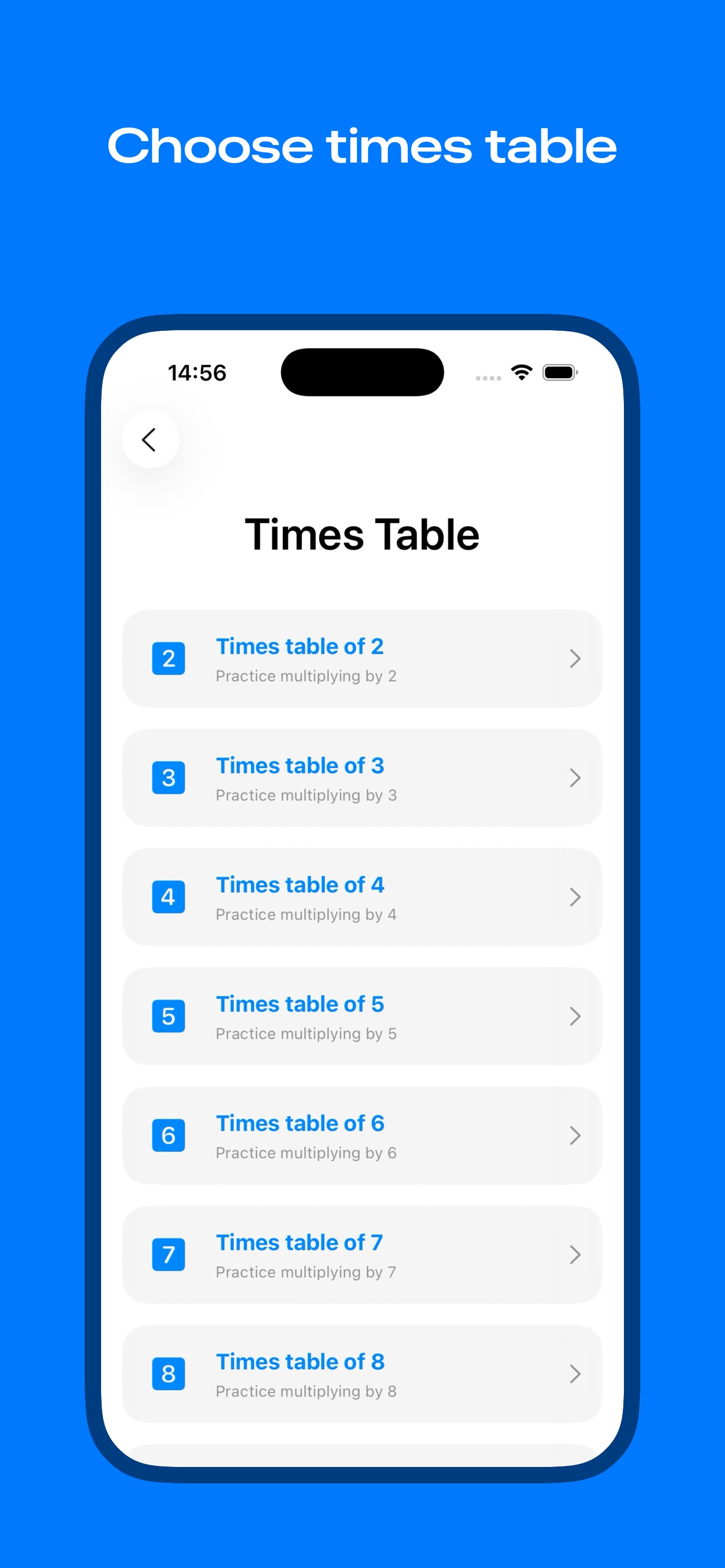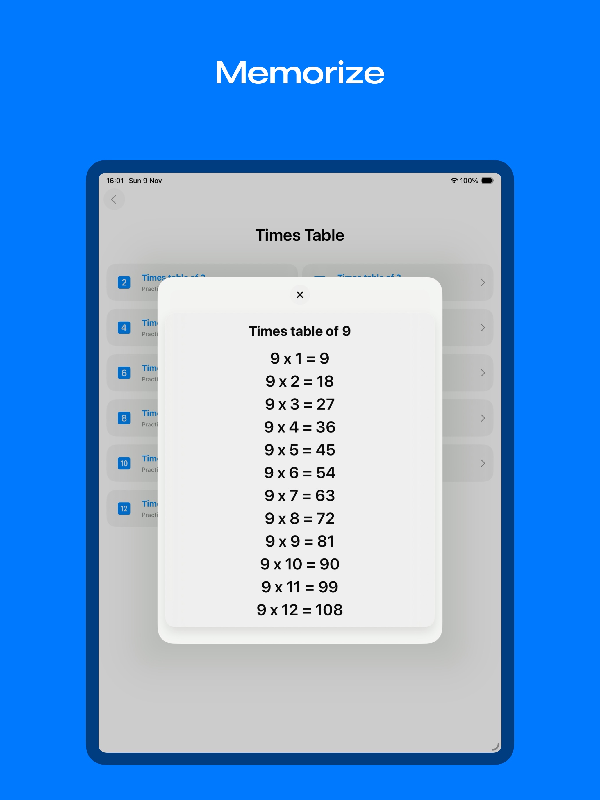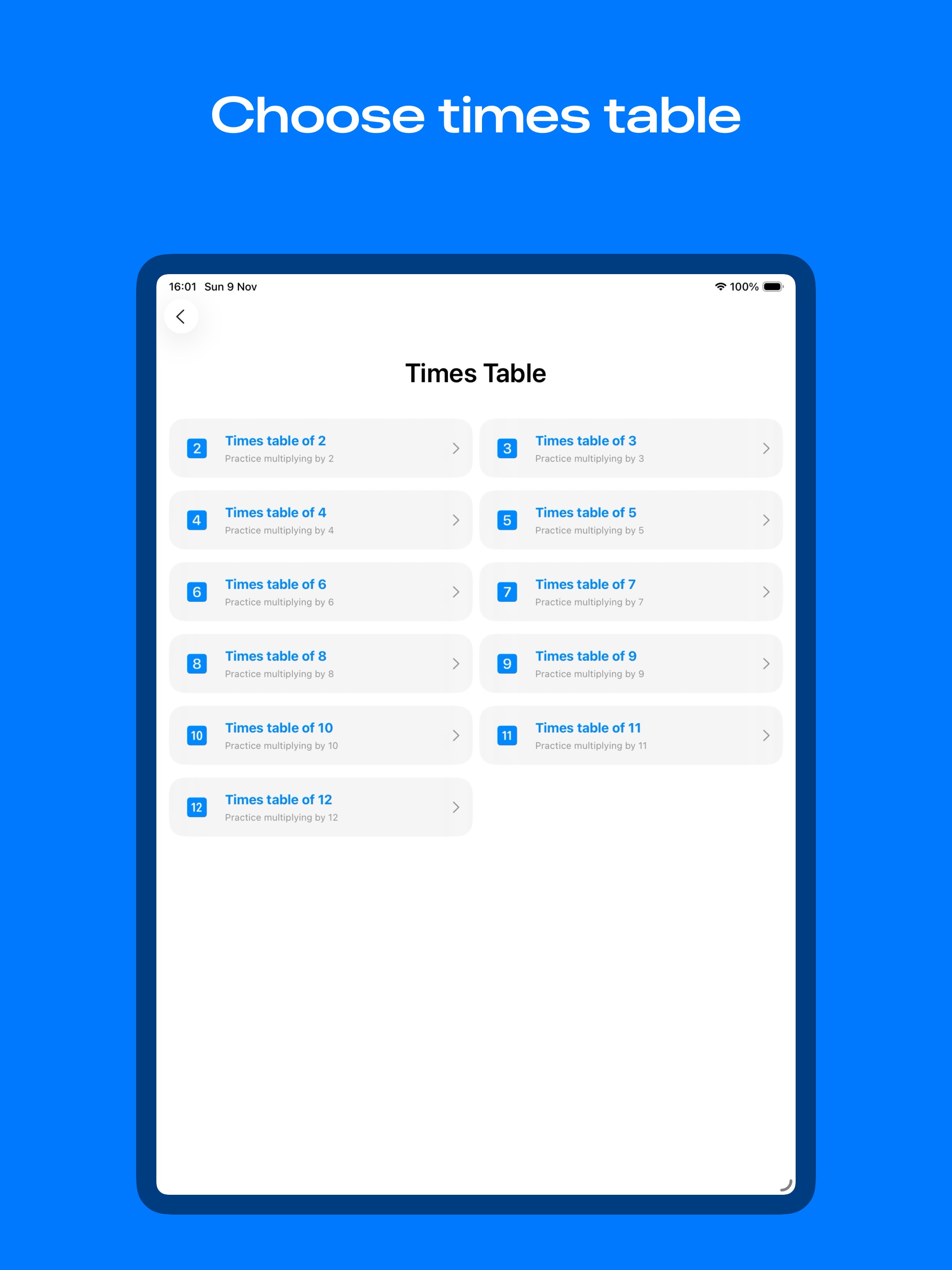 - Customizable multiplication tables: Choose which tables you want to practice.