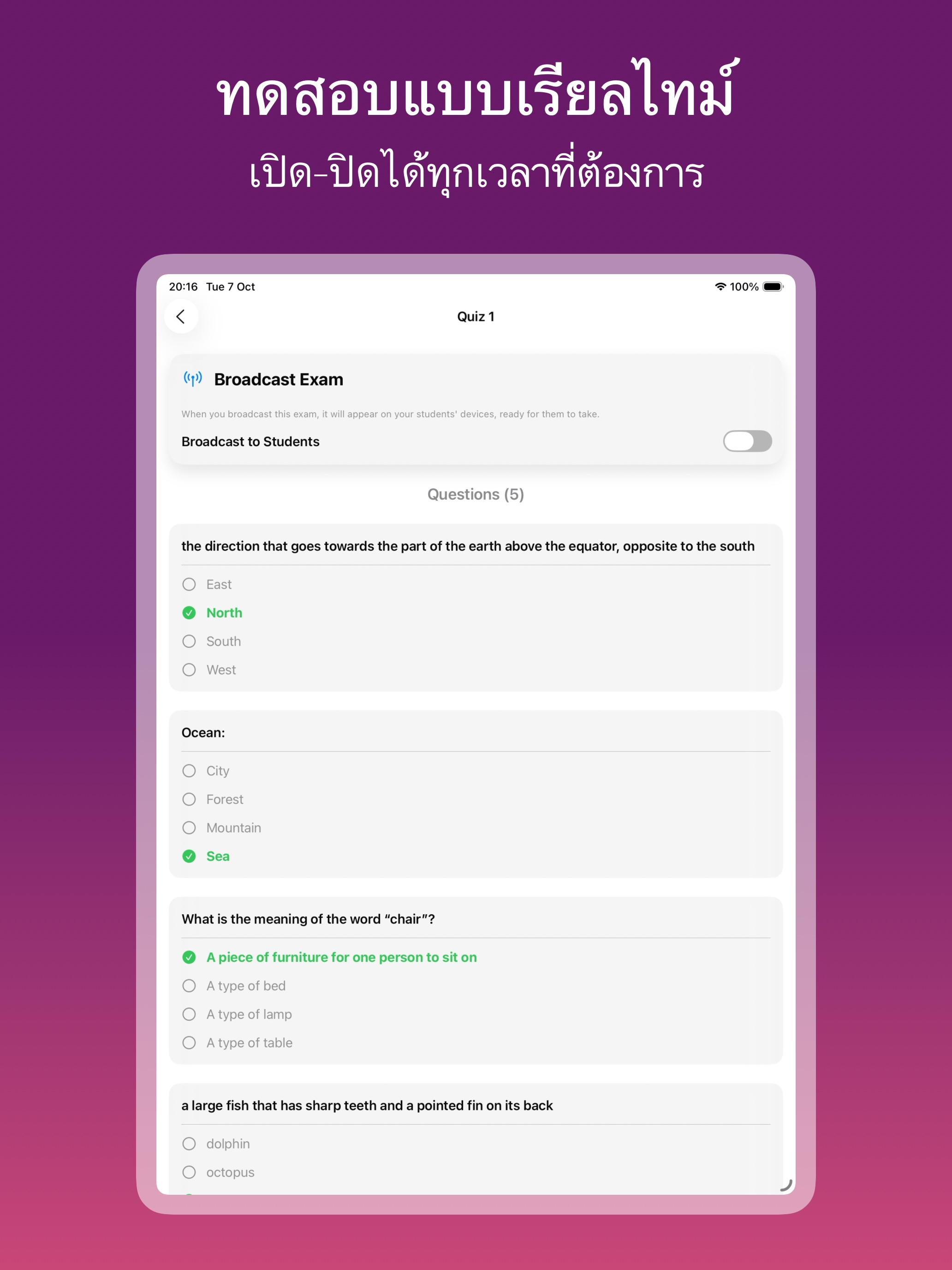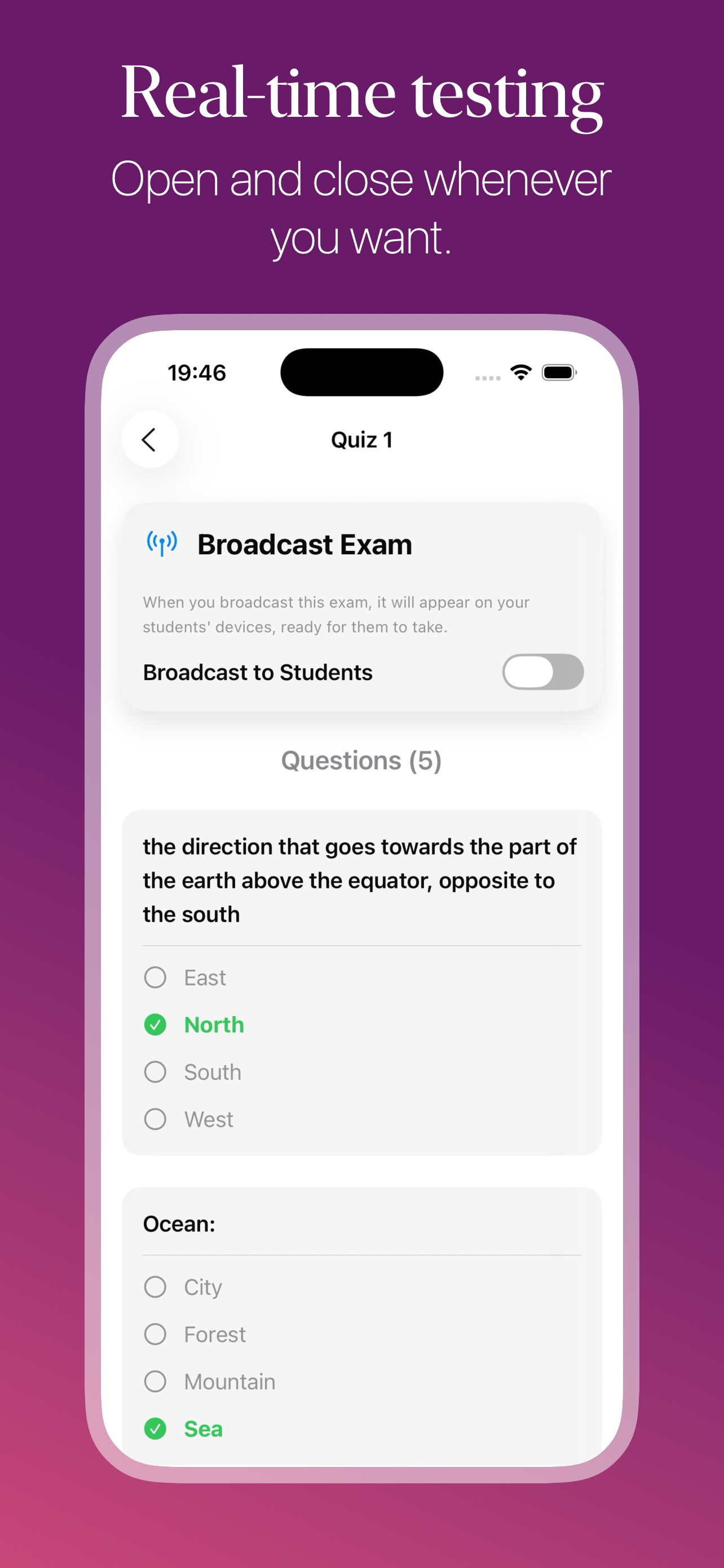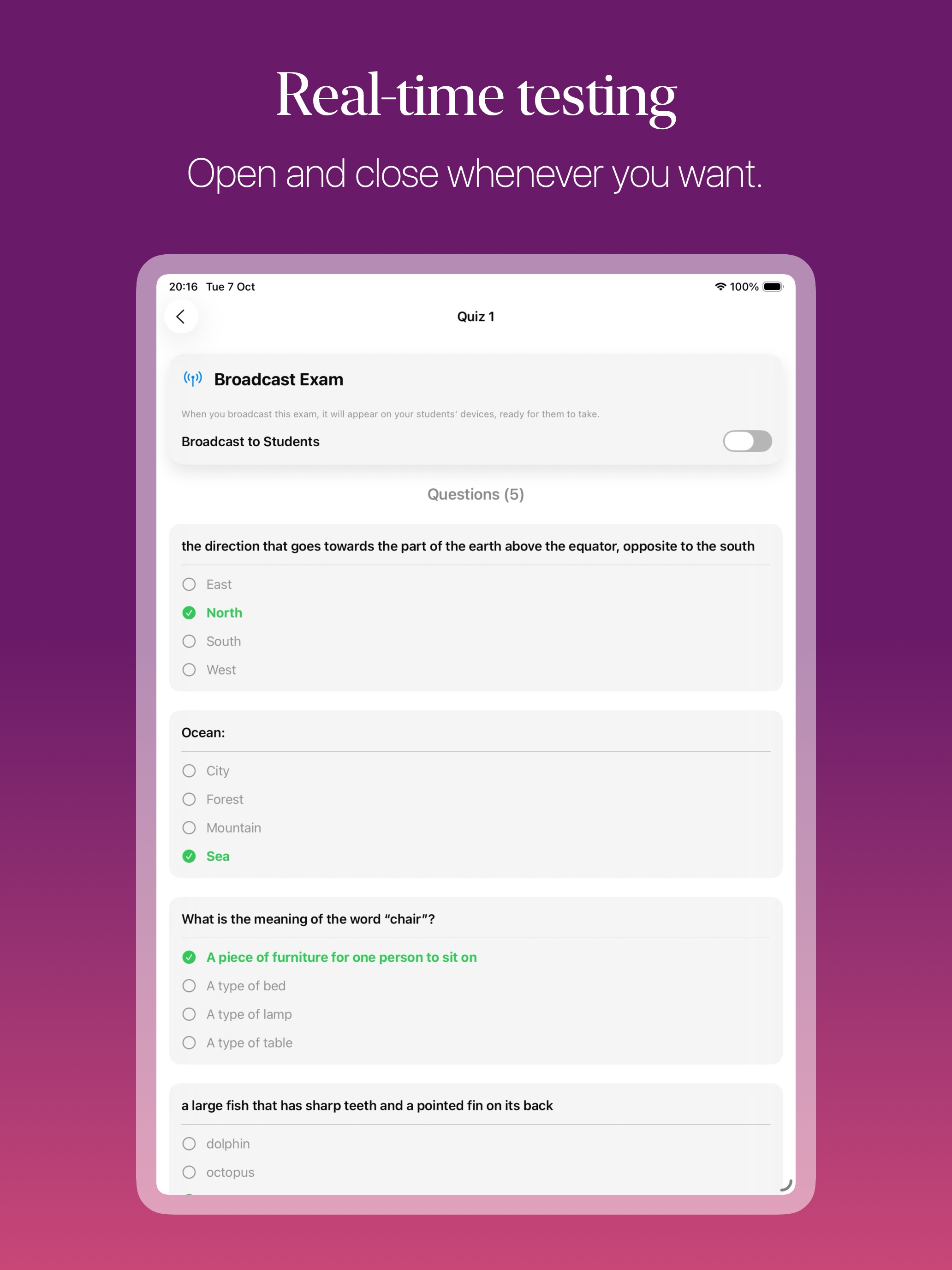 - Generate class codes and host Real-time Quizzes for simultaneous testing.